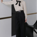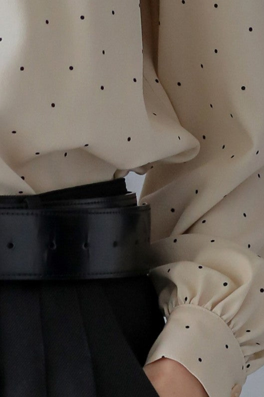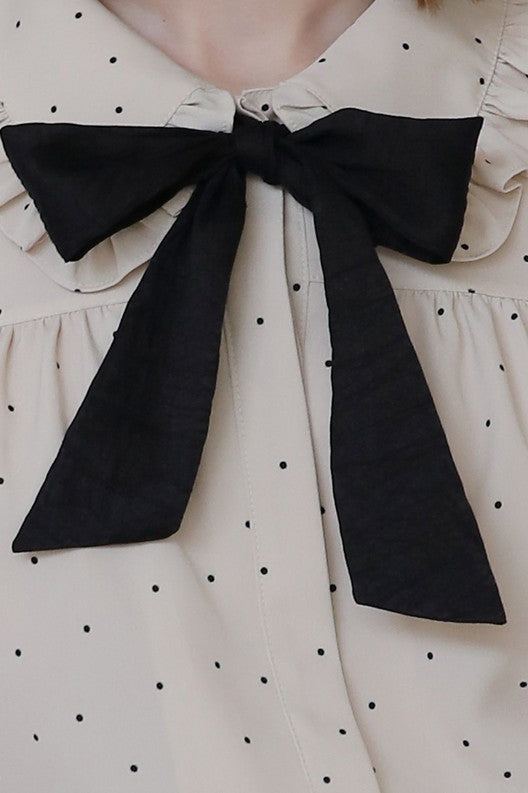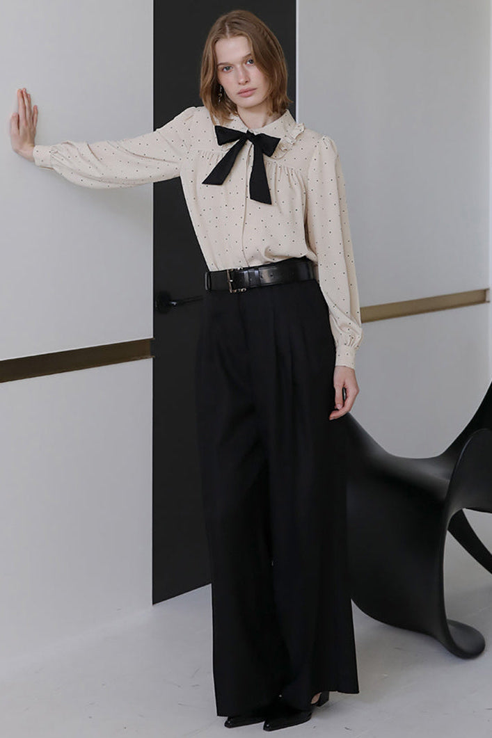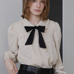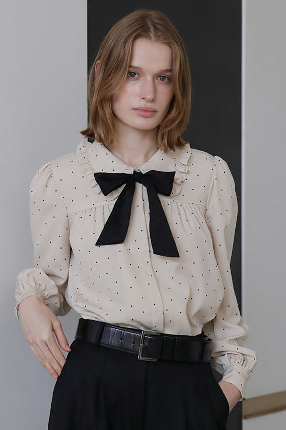 細膩的點狀圖案營造出優雅的米色調,並營造出奢華的氛圍。領口線上的荷葉邊細節完成了柔和且女性化的輪廓。黑色緞帶綁帶是表達經典又可愛氛圍的亮點。袖子上的皺褶設計創造出自然豐盈的線條。搭配褲子或裙子,可以從正式到日常造型多樣搭配。